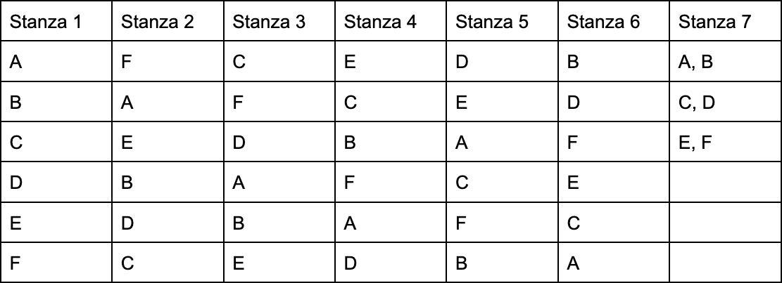Here’s how it works: choose six words, which will be the end words in each stanza, rotating according to a set pattern. The final half stanza uses two of the words within each of the lines. So you’ll have 6 stanzas of 6 lines each, plus another 3 lines at the end for a total of 39 lines. Here’s the pattern: