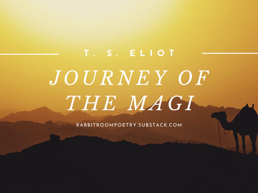 A cold coming we had of it, Just the worst time of the year For a journey, and such a long journey: The ways deep and the weather sharp, The very dead of winter.' And the camels galled, sorefooted, refractory, Lying down in the melting snow. There were times we regretted The summer palaces on slopes, the terraces, And the silken girls bringing sherbet. Then the camel men cursing and grumbling and running away, and wanting their liquor and women, And the night-fires going out, and the lack of shelters, And the cities hostile and the towns unfriendly And the villages dirty and charging high prices: A hard time we had of it. At the end we preferred to travel all night, Sleeping in snatches, With the voices singing in our ears, saying That this was all folly. Then at dawn we came down to a temperate valley, Wet, below the snow line, smelling of vegetation; With a running stream and a water-mill beating the darkness, And three trees on the low sky, And an old white horse galloped away in the meadow. Then we came to a tavern with vine-leaves over the lintel, Six hands at an open door dicing for pieces of silver, And feet kicking the empty wine-skins. But there was no information, and so we continued And arriving at evening, not a moment too soon Finding the place; it was (you might say) satisfactory. All this was a long time ago, I remember, And I would do it again, but set down This set down This: were we led all that way for Birth or Death? There was a Birth, certainly We had evidence and no doubt. I had seen birth and death, But had thought they were different; this Birth was Hard and bitter agony for us, like Death, our death. We returned to our places, these Kingdoms, But no longer at ease here, in the old dispensation, With an alien people clutching their gods. I should be glad of another death.